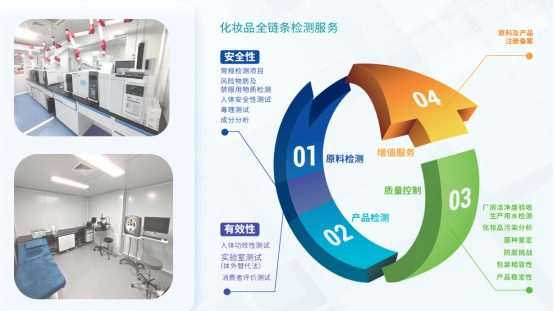 廣微集團建立了完備的美妝產業全鏈條檢測認證服務平台。該平台可以為美妝產業提供從廠房設計、工程檢測、工程驗收、環境檢測、設備計量到原料篩選測試、產品備案測試、產品毒理測試、產品功效測試、產品注冊備案以及產品出口認證等一條龍的技術服務。