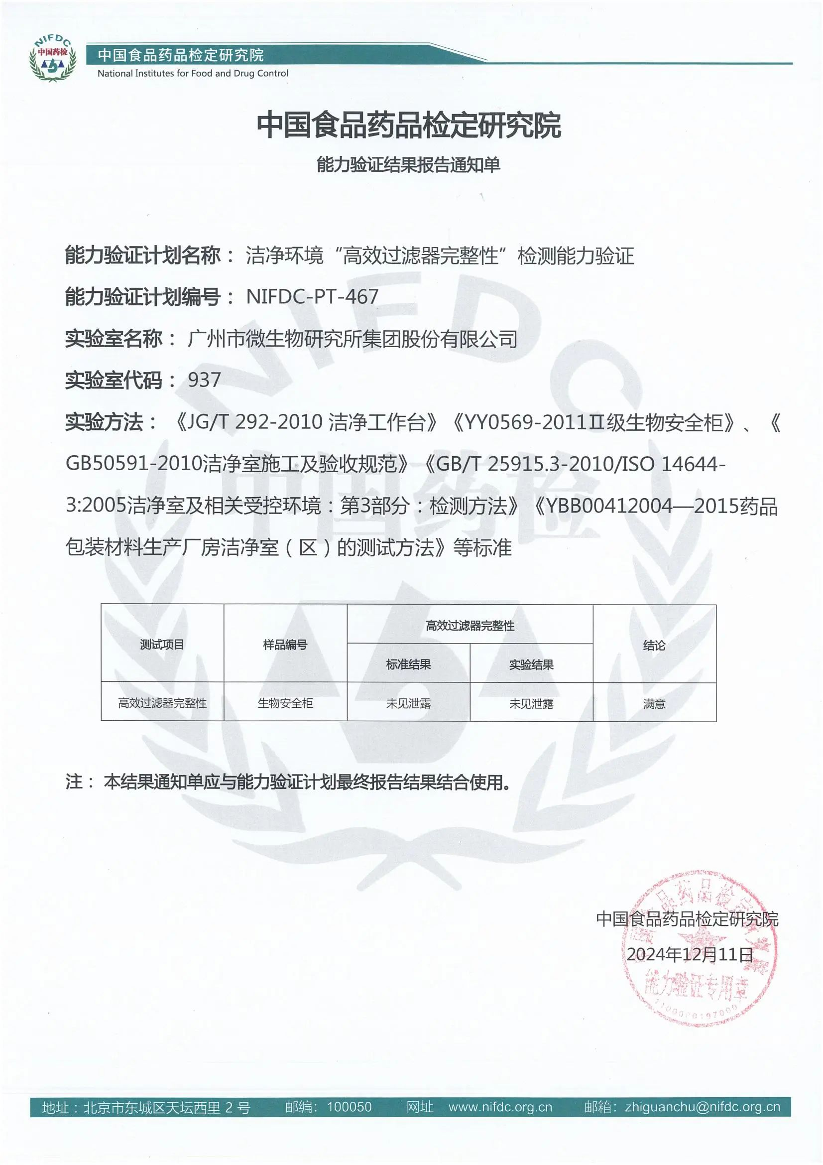 近日,廣州市微生物研究所集團股份有限公司(廣微集團)潔淨工程檢測室赴北京參加了由中國食品藥品檢定研究院藥用輔料和包裝材料檢定所組織的潔淨環境“高效過濾器完整性”檢測能力驗證項目,獲得“滿意”結果。