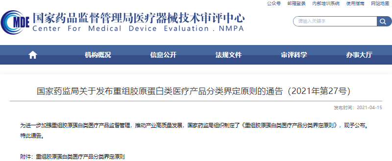 同時,重組膠原蛋白類產品作為醫用敷料應用時,若產品可部分或者全部被人體吸收,或者用於慢性創麵,按照第三類醫療器械管理;若產品不可被人體吸收且用於非慢性創照第二類醫療器械管理。