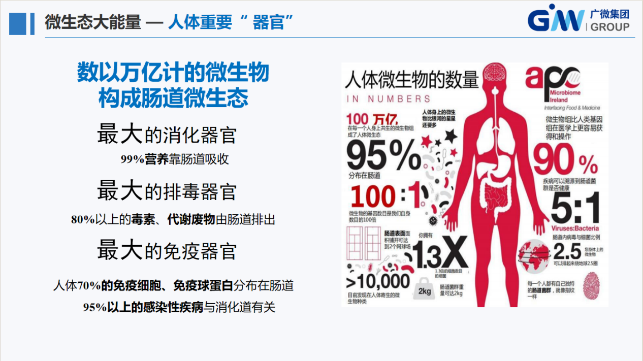 姚蕾部長以“益生菌市場探討及高新廣微在腸道益生菌領域現況介紹”為主題,從行業風口出發,深入分析、探(tan)討(tao)腸(chang)道(dao)益(yi)生(sheng)菌(jun)及(ji)其(qi)產(chan)業(ye)的(de)市(shi)場(chang)情(qing)況(kuang)。姚(yao)部(bu)長(chang)詳(xiang)細(xi)闡(chan)述(shu)了(le)當(dang)前(qian)益(yi)生(sheng)菌(jun)行(xing)業(ye)麵(mian)臨(lin)的(de)挑(tiao)戰(zhan),以(yi)及(ji)市(shi)場(chang)需(xu)求(qiu)對(dui)行(xing)業(ye)發(fa)展(zhan)的(de)影(ying)響(xiang)。腸(chang)道(dao)微(wei)生(sheng)態(tai)檢(jian)測(ce)不(bu)僅(jin)是(shi)健(jian)康(kang)管(guan)理(li)的(de)“晴雨表”,更是實現疾病預防、精jing準zhun醫yi療liao和he全quan生sheng命ming周zhou期qi健jian康kang維wei護hu的de關guan鍵jian工gong具ju。通tong過guo本ben次ci講jiang座zuo,廣guang微wei集ji團tuan將jiang深shen耕geng腸chang道dao微wei生sheng態tai領ling域yu,不bu斷duan加jia強qiang在zai該gai領ling域yu的de影ying響xiang力li和he品pin牌pai知zhi名ming度du,力li爭zheng在zai腸chang道dao微wei生sheng態tai的de廣guang大da市shi場chang中zhong樹shu立li品pin牌pai標biao杆gan。