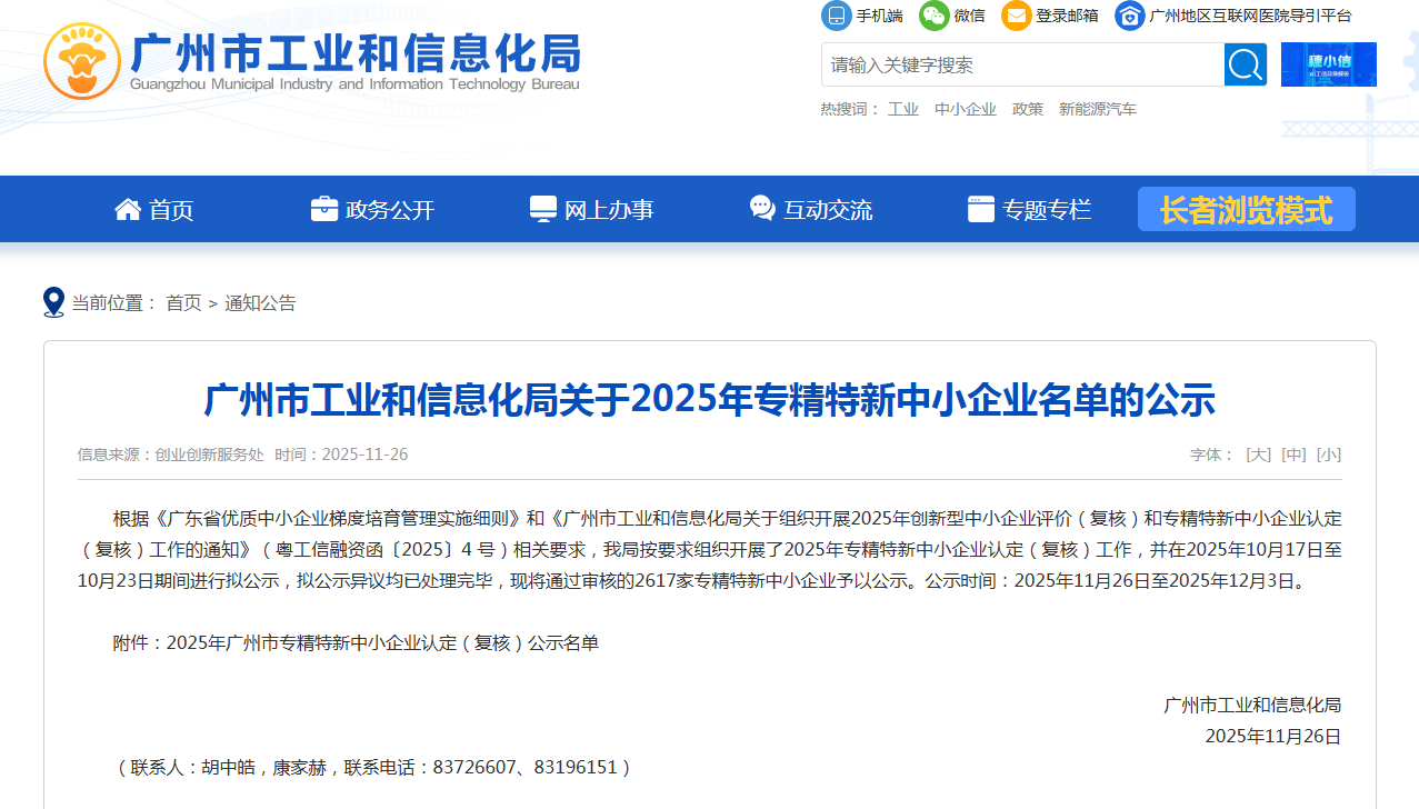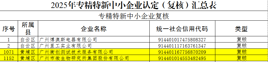 11月26日,廣州市工業和信息化局公布了2025年專精特新中小企業名單,名單包括776家2025年新認定企業和1841家複核企業,廣微集團及下屬企業衡創公司順利通過複核。