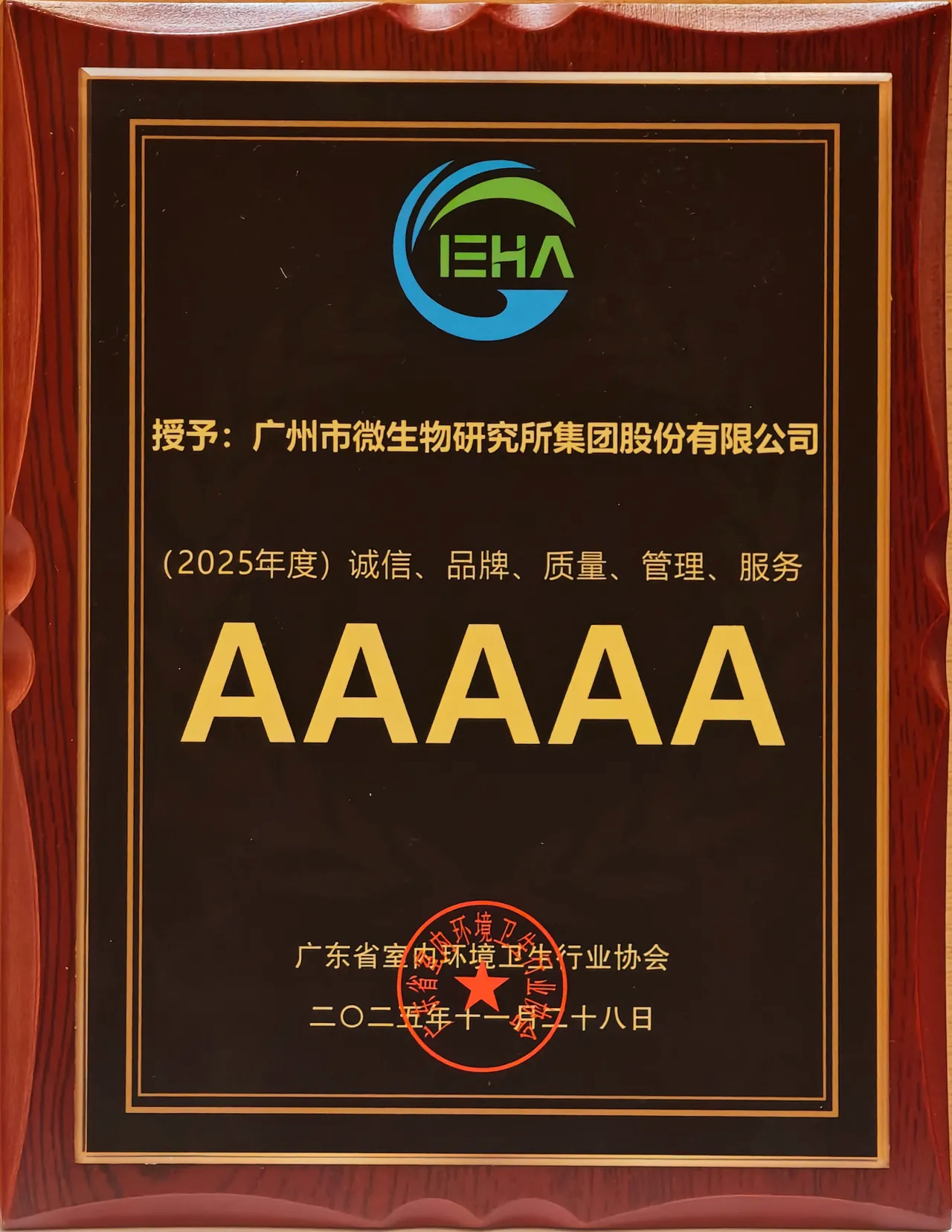 會上,廣州市微生物研究所集團股份有限公司榮獲 “2025年度(誠信、品牌、質量、管理、服務)5A企業”獎項。